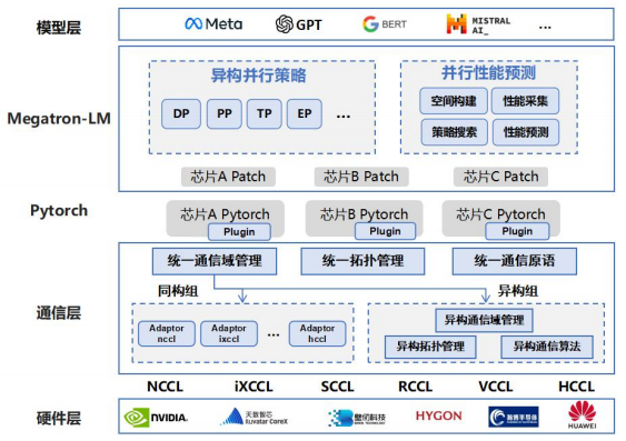 论文创新性设计了一种适用于异构混合智算资源池的大模型分布式并行训练方法,构建起“框架层-通信层”的端到端技术能力:既支持异构非均匀计算任务切分(根据不同芯片的算力差异动态分配计算任务),也能提供最优并行策略的性能预测与推荐,同时,还可实现多厂商互认的统一异构通信能力,其核心创新体现在三方面: