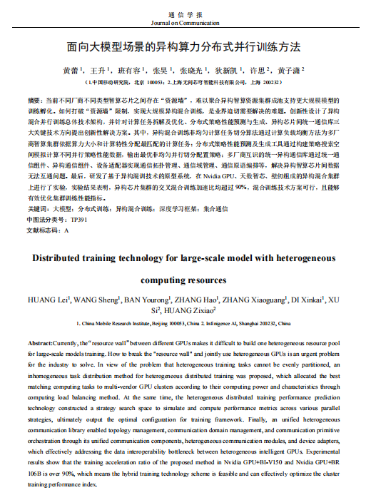 9月23日,中国移动研究院自主完成的论文《面向大模型场景的异构算力分布式并行训练方法》被CCF T1顶级期刊《通信学报》录用,该技术为异构算力合池训练提供了创新突破性解决方案,有效破解多厂商智算资源难以协同的行业痛点。